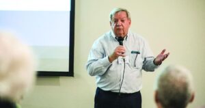 Ron Frisk, Herald-Zeitung conservative columnist, and Lynn Silver, liberal columnist, stand together at a Braver Angels event.